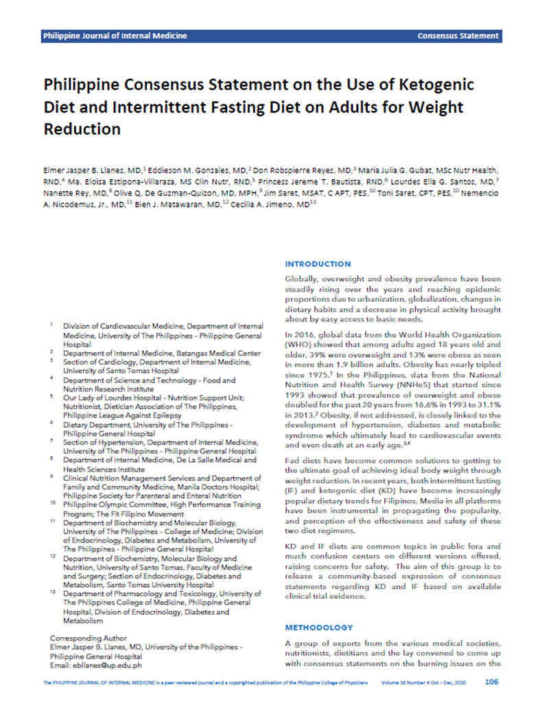 Philippine Consensus Statement on the Use of Ketogenic Diet and Intermittent Fasting Diet on Adults for Weight Reduction